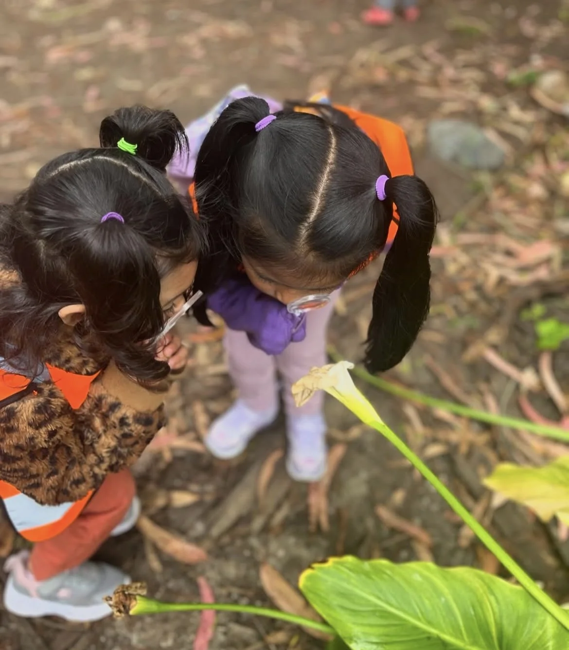 Two young explorers carefully observe a flower with magnifying glasses, discovering nature up close and sharing curiosity together.